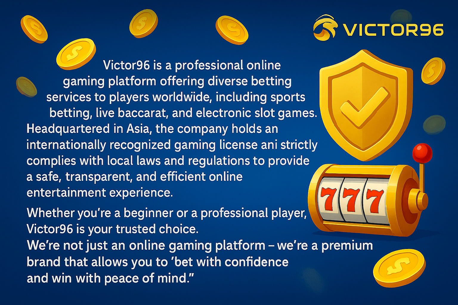 At Victor96, everything we do revolves around one central goal — to ensure that our players can bet with confidence and win with ease. With licensed operations, top-notch security systems, and exceptional customer support, you can rest assured that your online gaming experience will be nothing short of amazing.